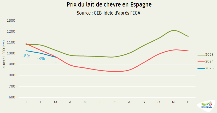 8 100 tonnes de fromages ont été produites en mars, soit un recul de 2% /2024. En cumul, 23 400 tonnes de fromages de chèvre ont été fabriquées au premier trimestre 2025 (-1% /2024).