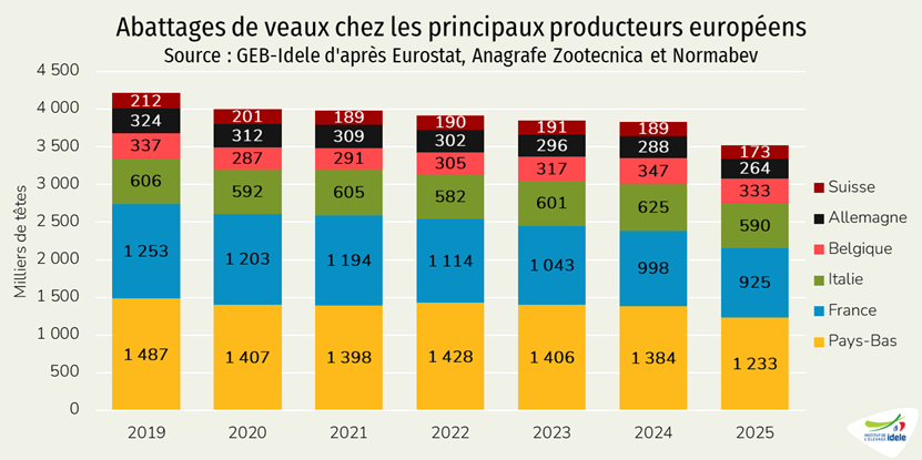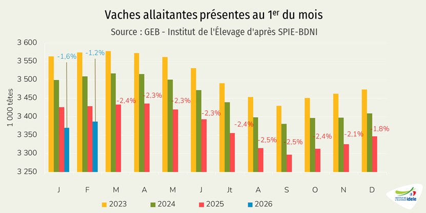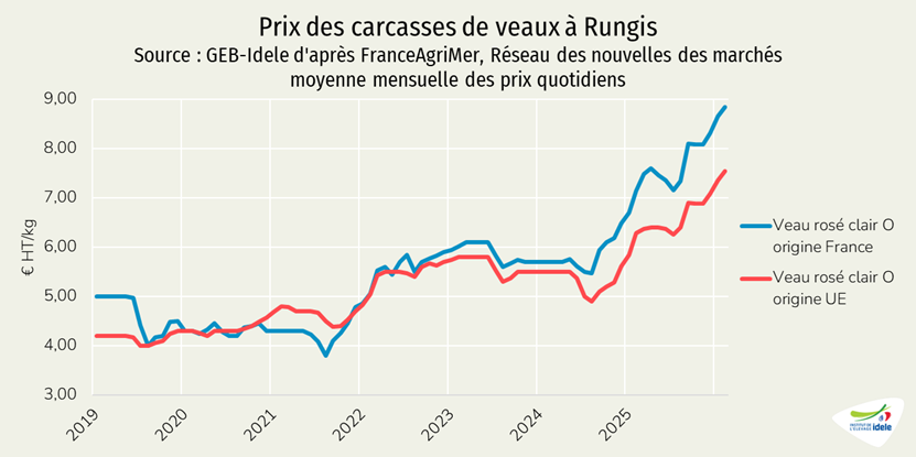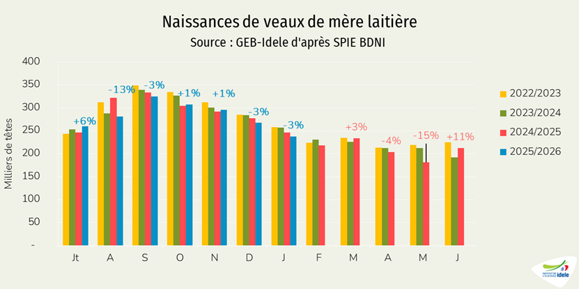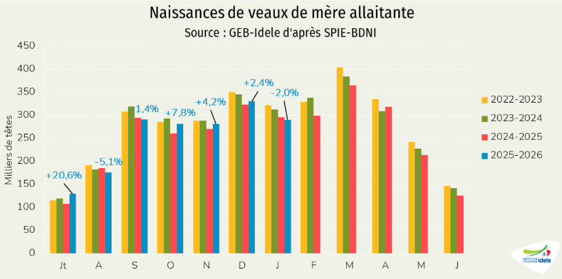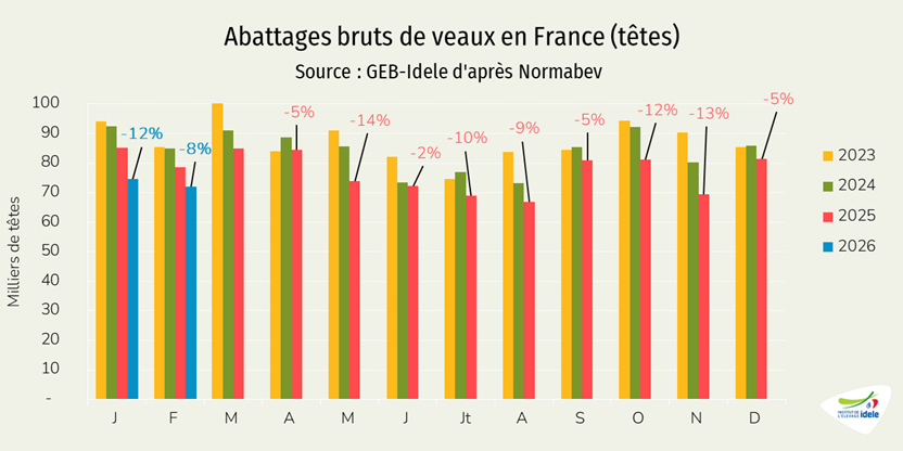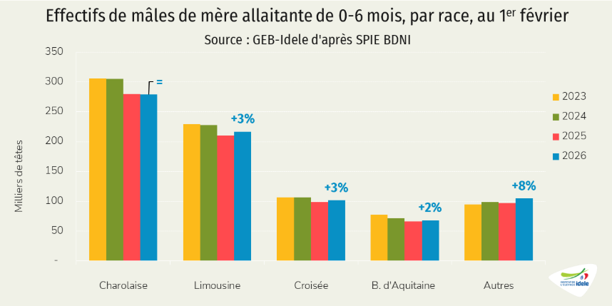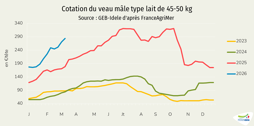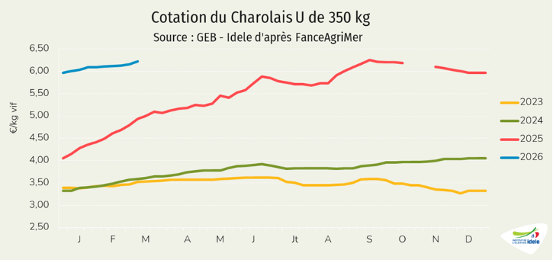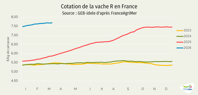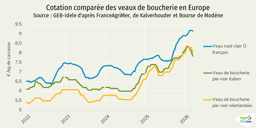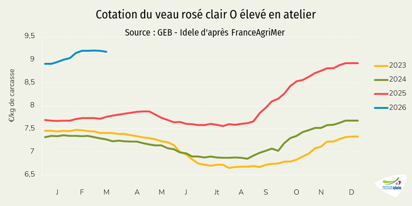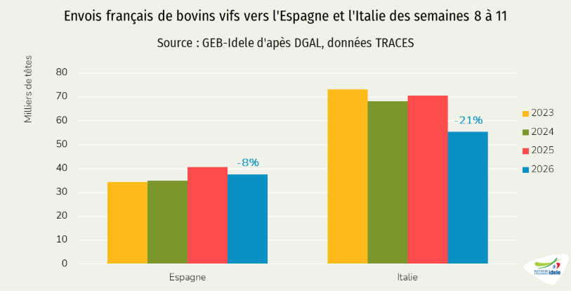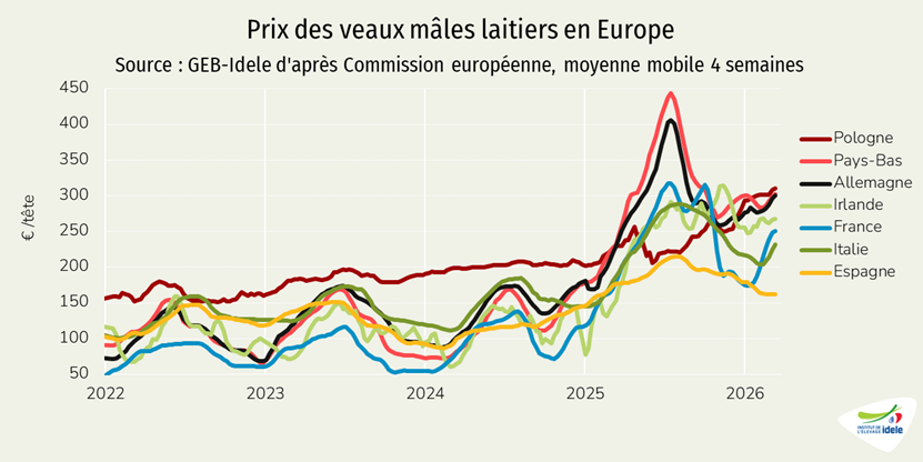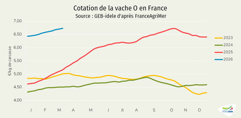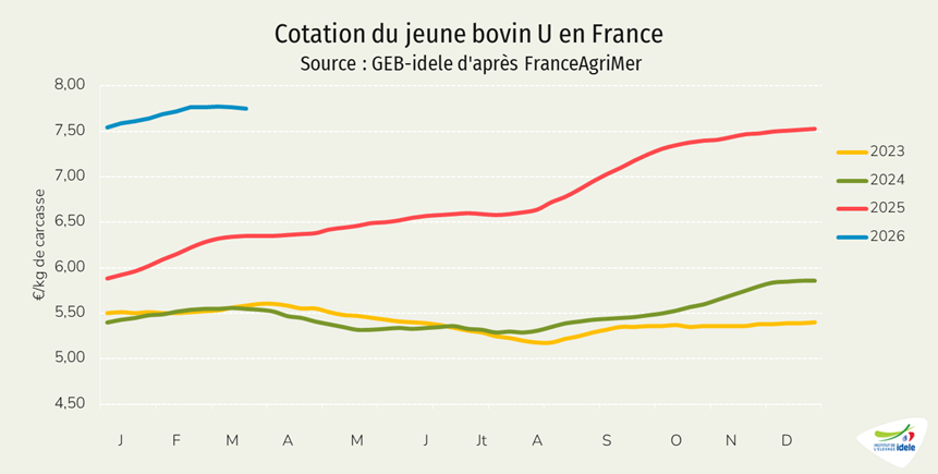 En France, les cours des vaches restent en hausse, creusant l’écart avec les autres États membres. Les prix des JB résistent à la baisse saisonnière et ceux des veaux gras demeurent à haut niveau. Les broutards et les veaux laitiers atteignent des niveaux inédits pour la saison, faute d'offre suffisante en animaux maigres. En Europe les cours sont plus fluctuants. Les prix des JB italiens se sont stabilisés. Le ramadan n’a pas fait recette en Espagne et le déclenchement du conflit au Moyen-Orient a fait réagir le marché, tout comme en Pologne qui craint pour ses ventes vers la Turquie.