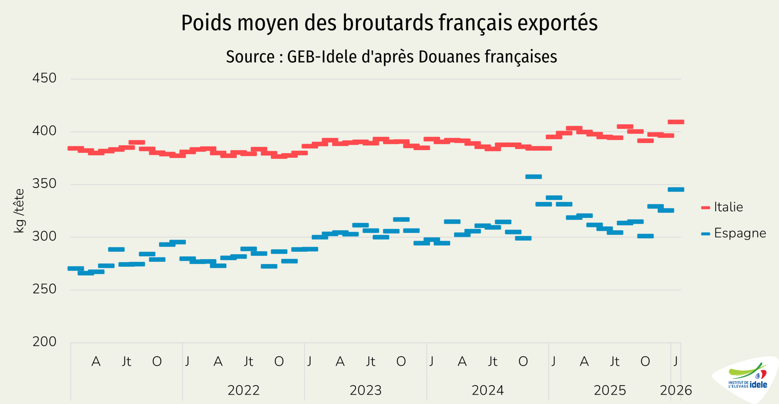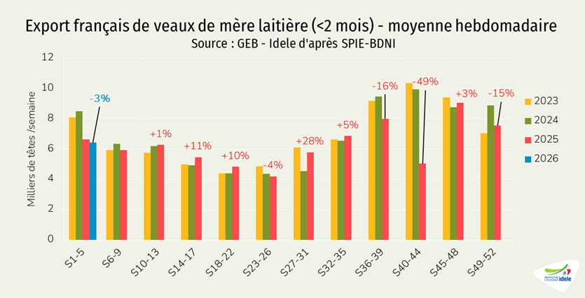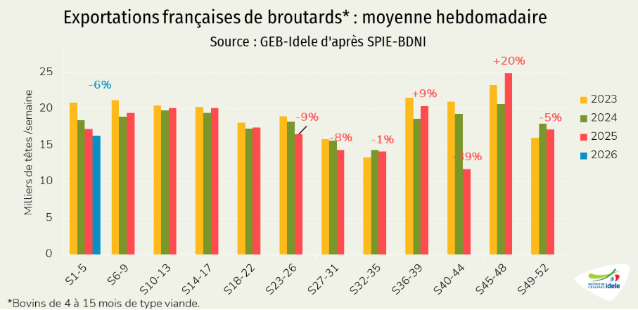 L’année 2026 a démarré avec des exports peu dynamiques. En janvier, 17 300 téc de viande bovine ont été exportées de France, en recul de 7% /janvier 2025 (-1 300 téc). La viande de jeune bovin français est moins bien positionnée à l’export que d’autres origines européennes depuis quelques mois (lien vers notre article sur les jeunes bovins en Europe) ce qui a quelque peu freiné les expéditions.
