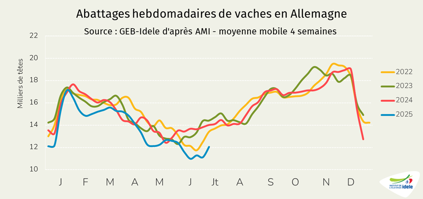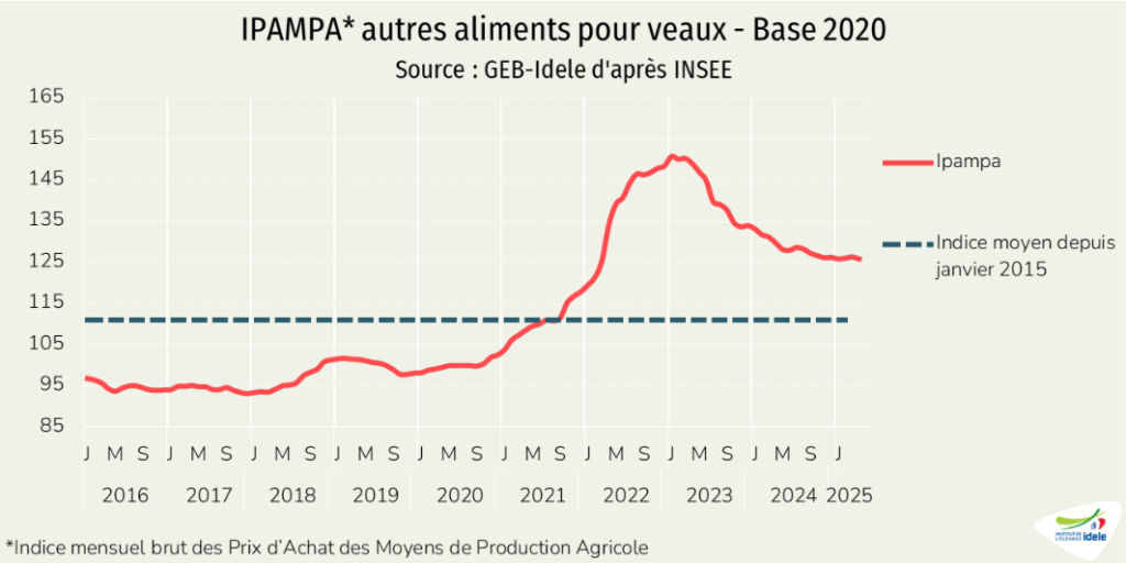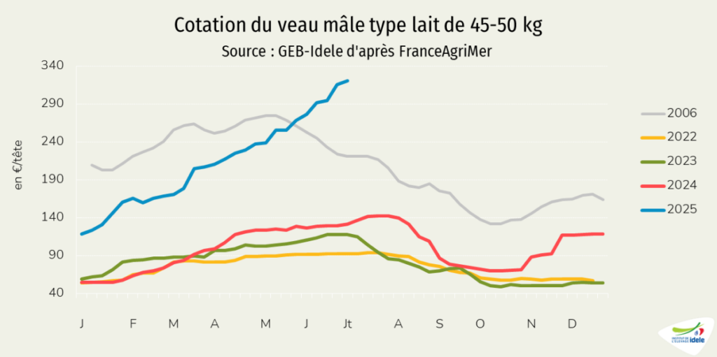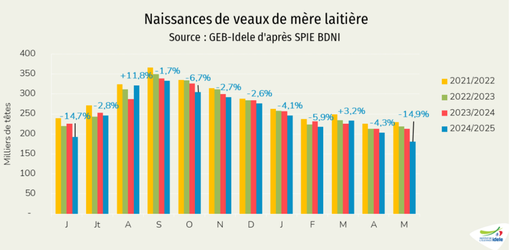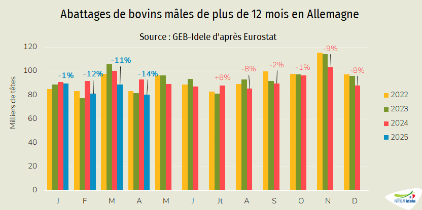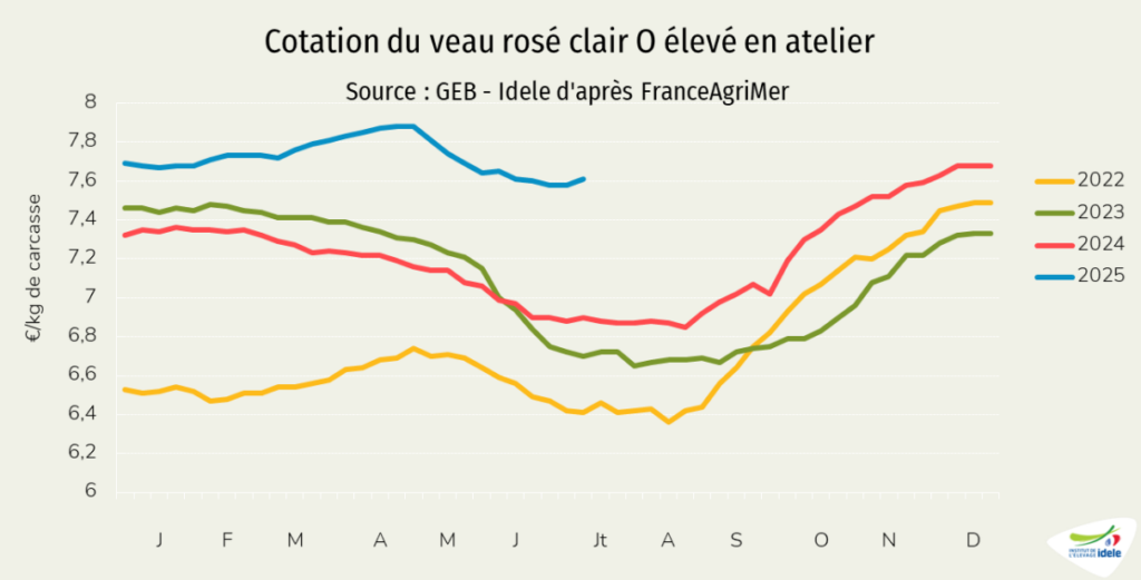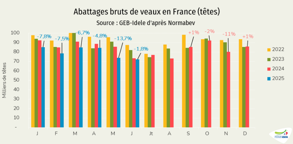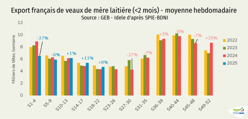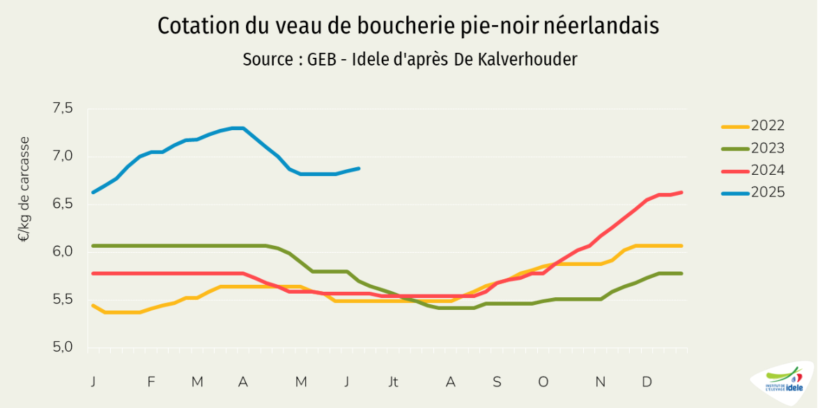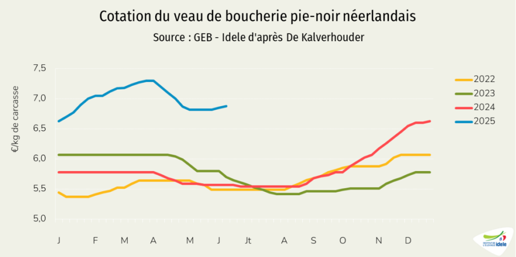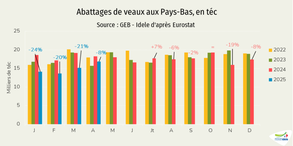 Dans le détail, elles ont reculé de 12% /2024 depuis les Pays-Bas, notre principal fournisseur (-4 000 téc, à 30 000 téc) du fait du recul historique des abattages néerlandais de veaux au premier quadrimestre (-18% / 2024 ou -13 000 téc). Nos achats depuis le Royaume-Uni, en partie envoyés vers d’autres États membres, ont reculé de 5% par rapport à 2024 (-1 000 téc, à 17 000 téc). Nos achats en Espagne s’effondrent depuis le début de l’année : -18% (-1 500 téc) à 8 000 téc, les abattages espagnols ayant reculé de 4% au premier quadrimestre et la demande de la rive sud méditerranéenne attirant une partie des carcasses ibériques.