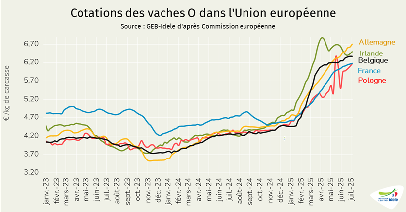 L’offre en bovins est toujours limitée en Europe, ce qui maintient les prix à haut niveau. La France ne fait pas exception et les prix sont encore en hausse pour certaines catégories. La consommation française de viande bovine a fléchi sur les cinq premiers mois de l’année, contrainte par le manque d’offre et la hausse des prix au détail. Les risques sanitaires inquiètent la filière. Les passages de MHE et FCO ont conduit à des baisses de naissances. Les restrictions de mouvements d’animaux liées à la DNC sont circonscrites à une zone limitée et concernent principalement des veaux laitiers.