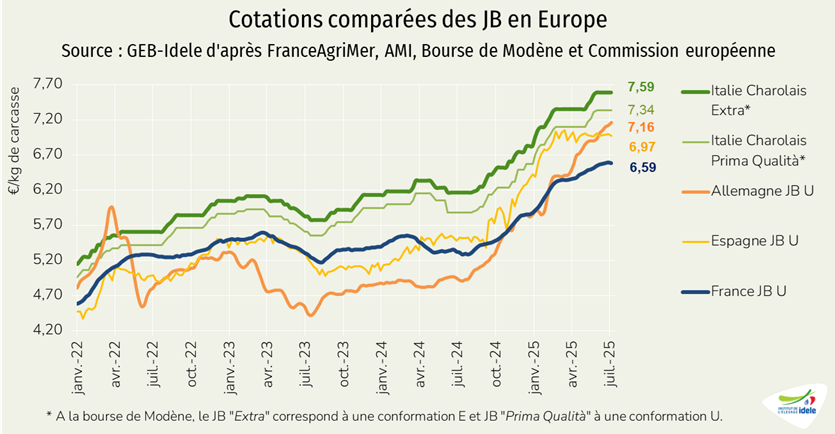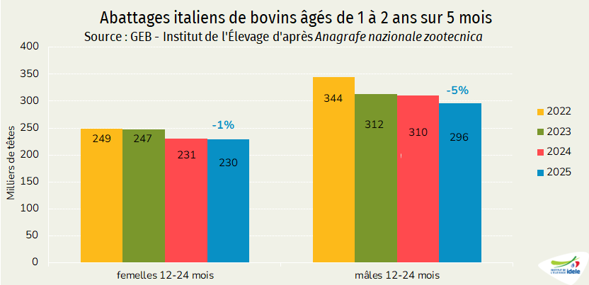 - vers l’Italie (+9% /2024 ou +2 000 tec, à 22 500 téc) du fait de la baisse de la production transalpine, avec la raréfaction des broutards français et la compétition entre Italie et Espagne pour les acheter (voir notre article sur les broutards),