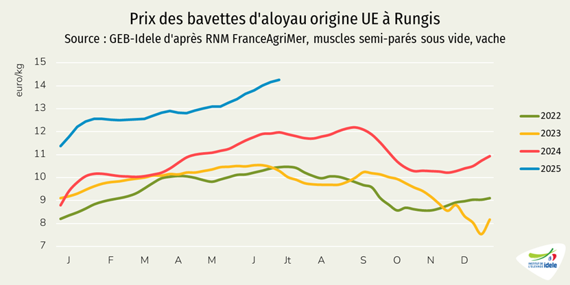 D’après Agreste pour les abattages, et les Douanes pour le commerce extérieur du dernier mois, le disponible consommable de mai était de 108 000 téc (-7% /2024). La part d’import dans le disponible consommable a augmenté de deux points (à 28%) comparé à un an plus tôt, car les abattages ont reculé en mai, mais pas les imports.