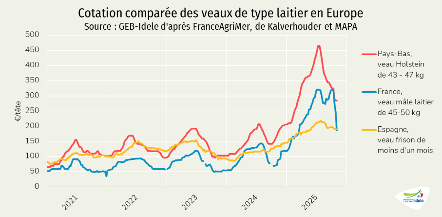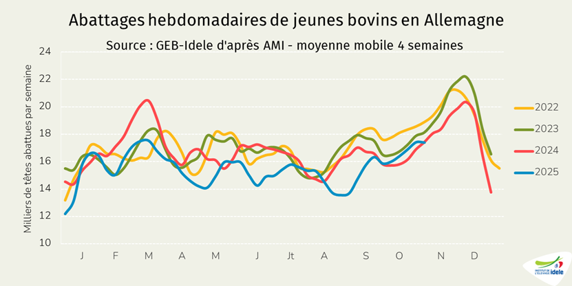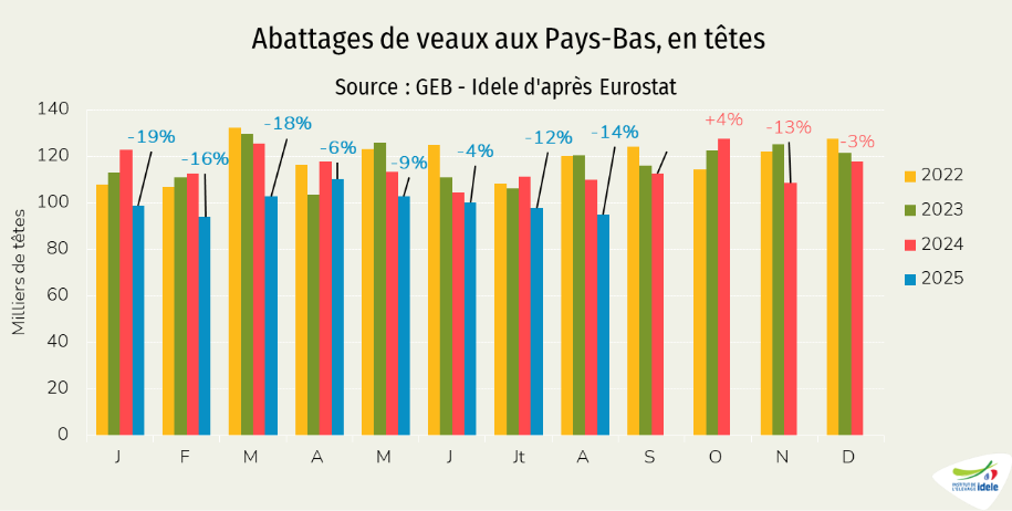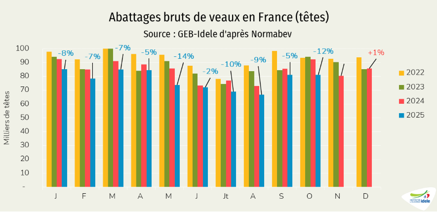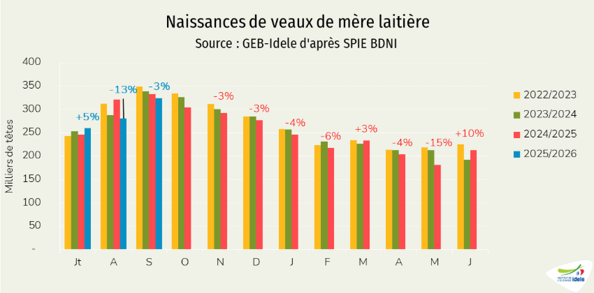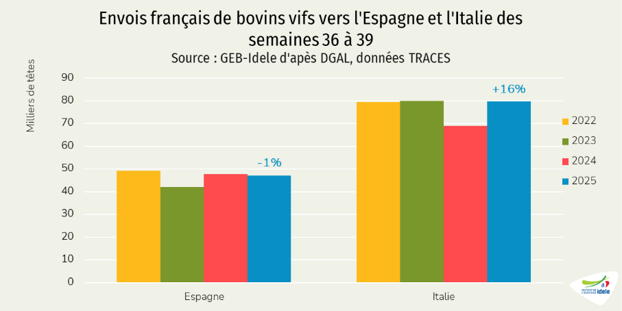 Dans le détail, la hausse du nombre de vaches laitières (+2% /2024) et de bœufs (+7%) était compensée par la baisse du nombre de vaches de type viande (-3%), de jeunes bovins de type viande (-4%) et de jeunes bovins laitiers (-7%).