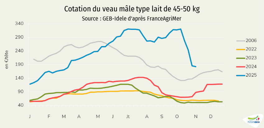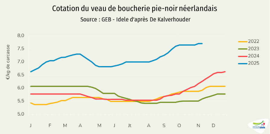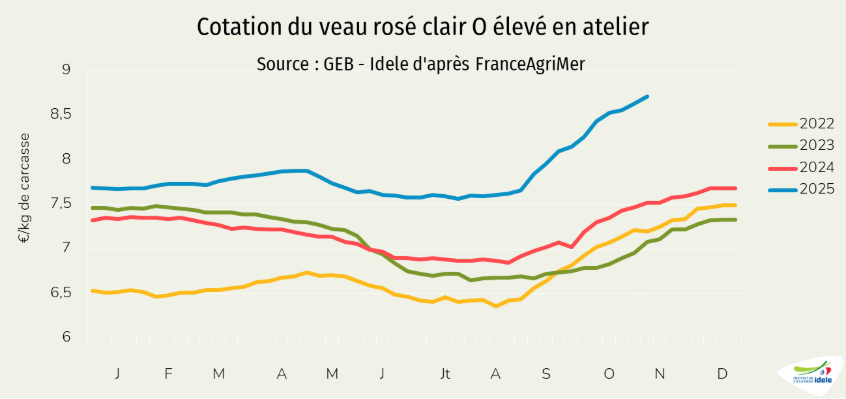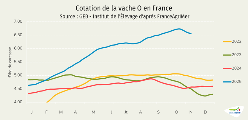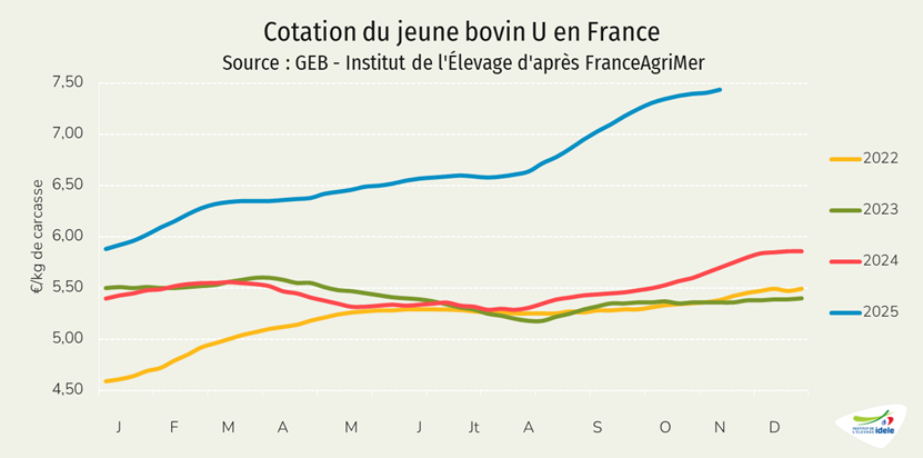 La cotation du jeune bovin O, à 6,74 €/kg en semaine 46 (+40% /2024) a encore gagné 4 centimes en quatre semaines.