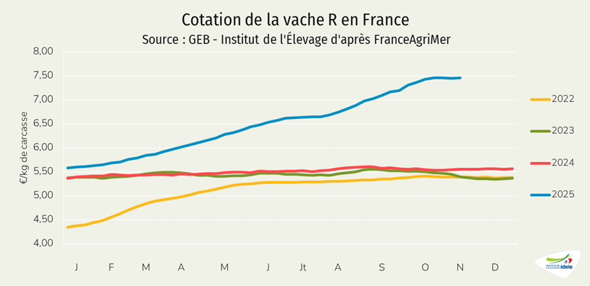 La cotation de la vache R a gagné 1,88 €/kg depuis le début de l’année, à 7,46 €/kg de carcasse en semaine 46 (+34% /2024). La cotation de la vache U standard atteignait 7,78 €/kg de carcasse (+28% /2024). Elle a gagné 63 centimes depuis le début de l’année.