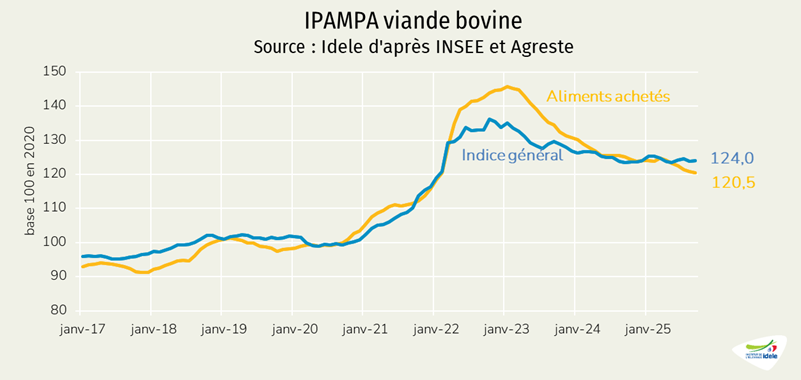 L’IPAMPA viande bovine (indice des prix d’achat des moyens de production agricoles) évolue peu depuis plusieurs mois. En septembre, il est très légèrement remonté (+0,1% /août 2025 et +0,4% /septembre 2024) malgré la baisse du prix de l’aliment, en raison de la hausse du prix de l’énergie.