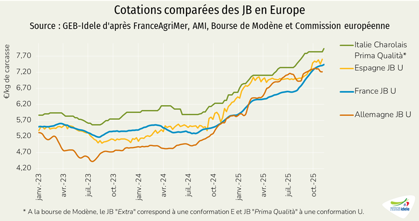 Les cotations des jeunes bovins finis poursuivent leur hausse. L’augmentation du prix du broutard nécessite de passer des hausses sur les animaux finis en France comme en Italie, ce que permet le marché européen qui reste en manque de viande de JB.