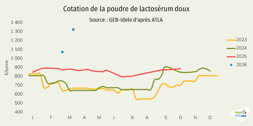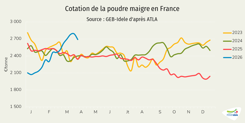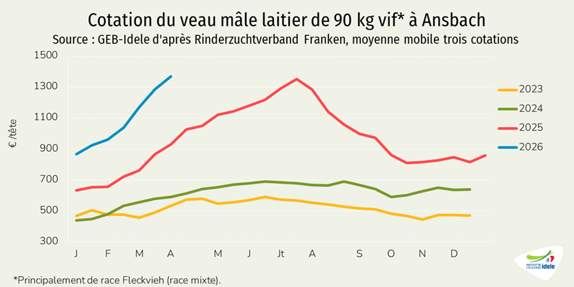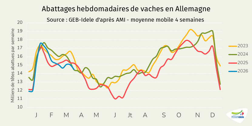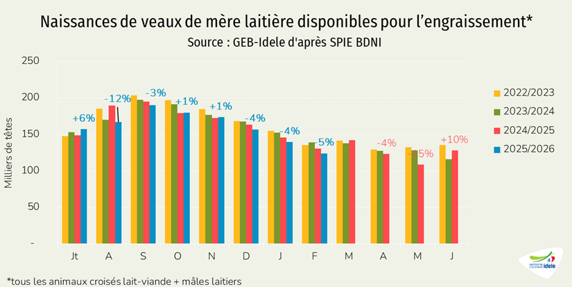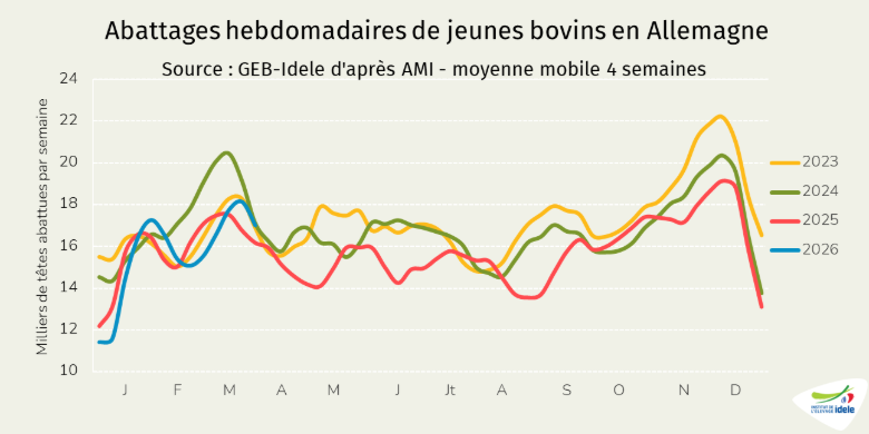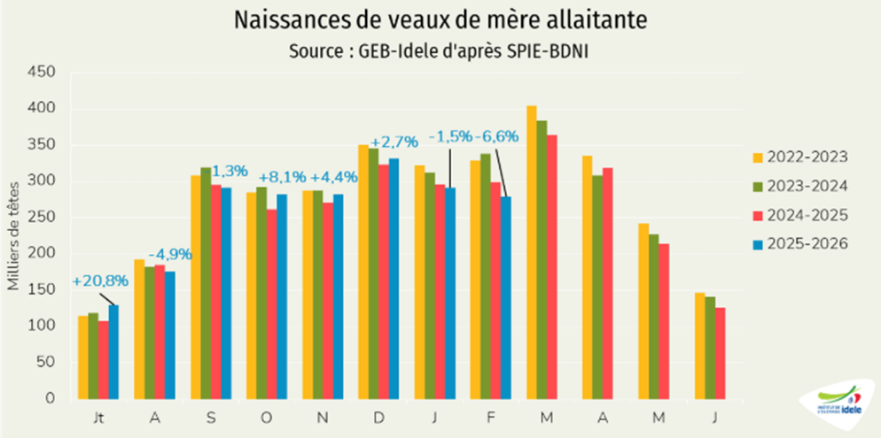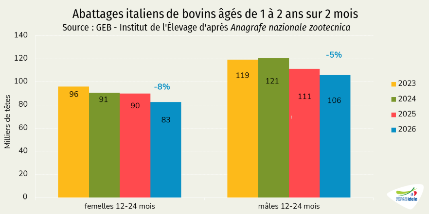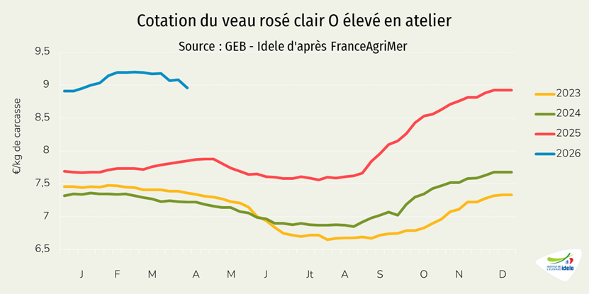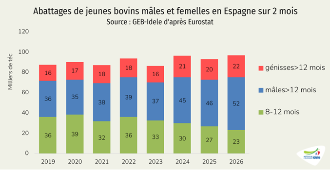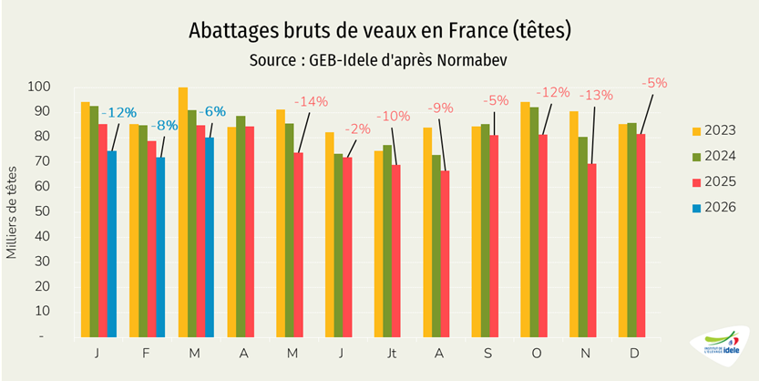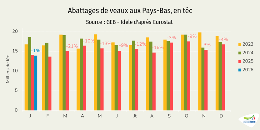 - -1% /2025 depuis les Pays-Bas, notre principal fournisseur, à 12 000 téc, une baisse très modeste comparée au recul de de la production néerlandaise de viande de veau (-17% /2025 en janvier 2026),