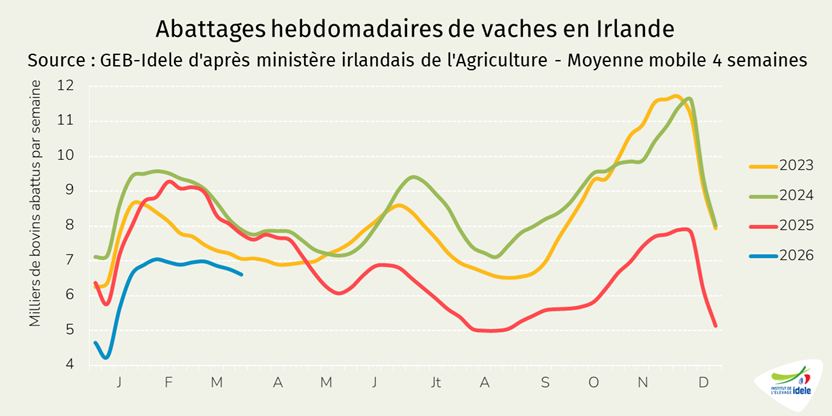 - -7% /2025 depuis l’Irlande, à 9 000 téc, en lien avec la chute drastique des abattages de vaches sur l’île (-23% d’après l’indicateur du ministère de l’Agriculture irlandais sur la période ),