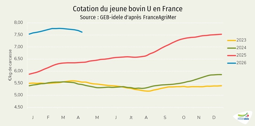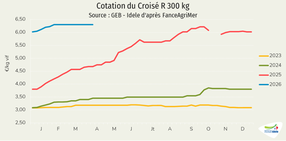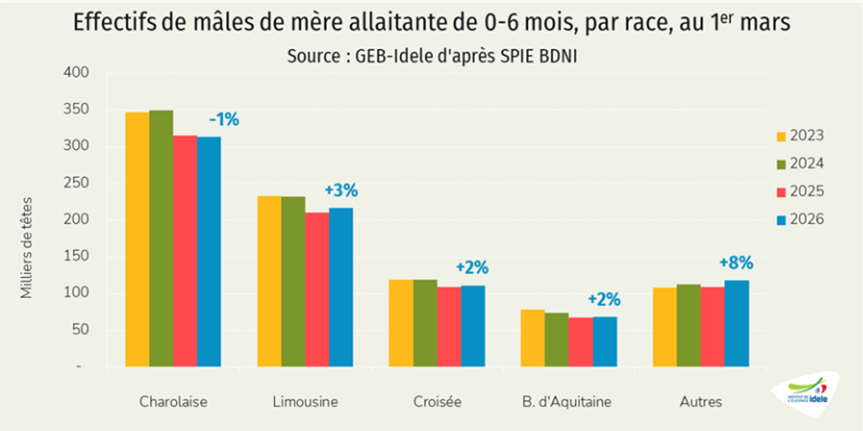 Le disponible consommable de viande bovine et de veau a progressé de 2% comparé à 2025 sur les deux premiers mois de l’année, à 238 000 téc. La production était en légère progression de 0,7% sur un an, en CVJA (corrigées des variations inter journalières annuelles selon Agreste). Elle a augmenté en femelles laitières, en jeunes bovins viande et en bœufs. A cela s’ajoute le recul des exportations de viande bovine (-9% en janvier-février 2026 /2025) maintenant davantage de viande sur le marché national.