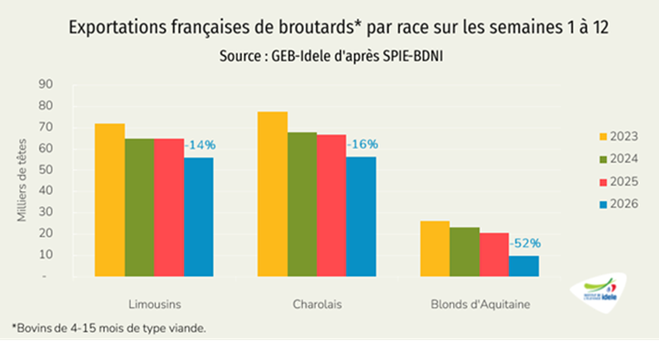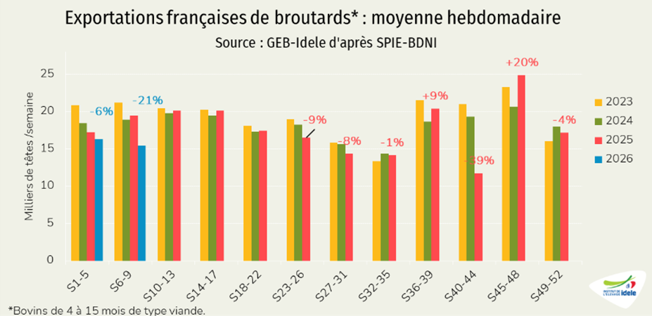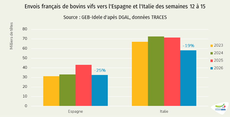 - vers l’Italie (-14% /2025, -1 200 téc) à 7 000 téc, alors que le début d’année 2025 avait été dynamique, du fait des prix français alors attractifs et du manque de viande dans la Botte italienne.