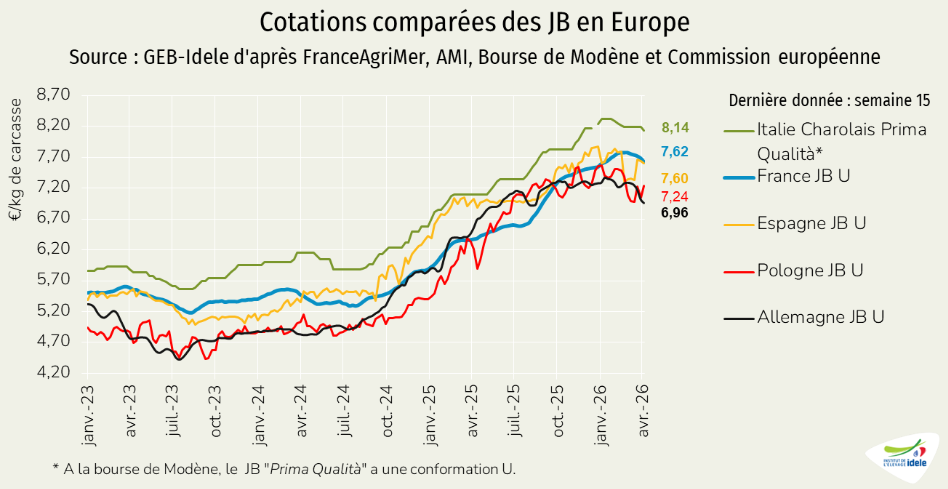 En mars selon l’INSEE, l’inflation générale était de 1,7% sur un an (contre 0,9% un mois plus tôt). Cette accélération s’explique par la guerre au Moyen Orient qui a entraîné un bond du prix de l’énergie (+7,4% en un an, contre -2,9% un mois plus tôt). L’indice de prix des produits manufacturés recule de 0,6% contre 0,2% de baisse un mois plus tôt. L’alimentaire a ralenti son rythme de hausse, à 1,8% sur un an contre 2,0% le mois précédent. L’alimentaire frais progressait de 1,4% sur un an, l’ensemble des viandes de 3,6%, contre 3,4% un mois plus tôt. En février (dernière donnée disponible) le prix du bœuf et du veau progressait de 11% sur un an, comme le mois précédent. La hausse générale de l’inflation devrait se poursuivre dans les semaines ou mois à venir, du fait du conflit et de son impact sur les prix de l’énergie.