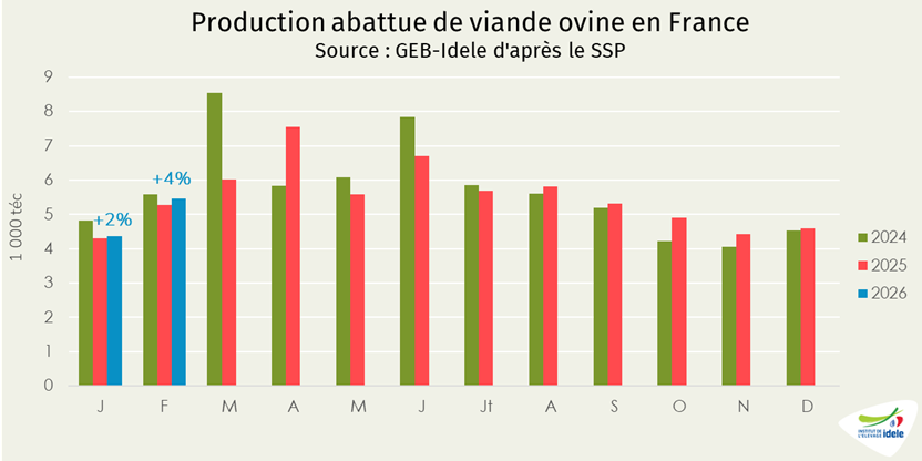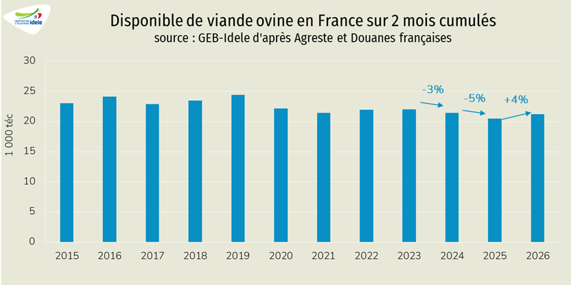Sur les deux premiers mois de 2026, la production française et les importations de viande ovine ont rebondi d’une année sur l’autre, conduisant à une hausse du disponible consommable.
