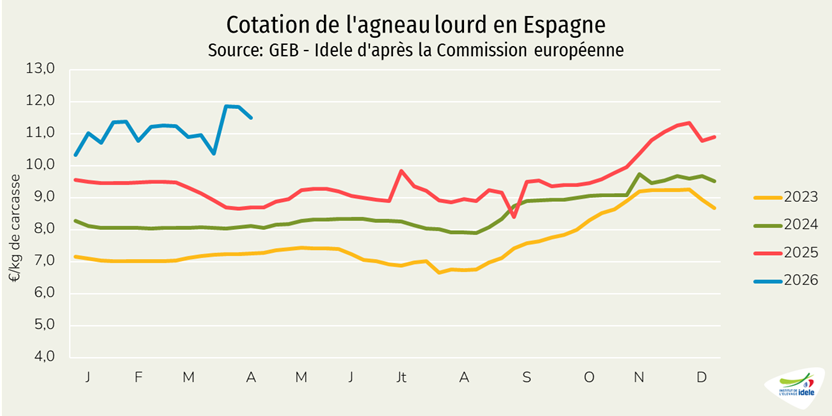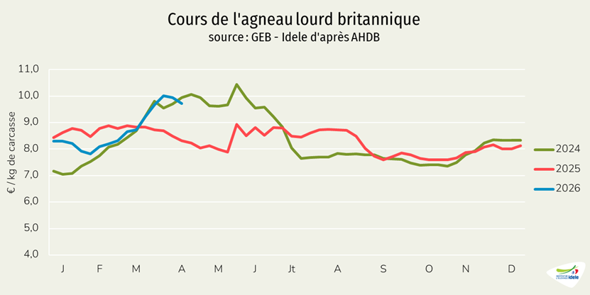 La filière redoute une chute de la cotation après l’Aïd (fin mai), comme l’an passé, avec un marché encombré : les agneaux espagnols arriveront sur le marché français après avoir fourni les pays du Moyen-Orient (contrats jusqu’à la mi-mai). La consommation des ménages français pourrait de nouveau baisser du fait de l’impact de la guerre en Iran sur leur pouvoir d’achat.