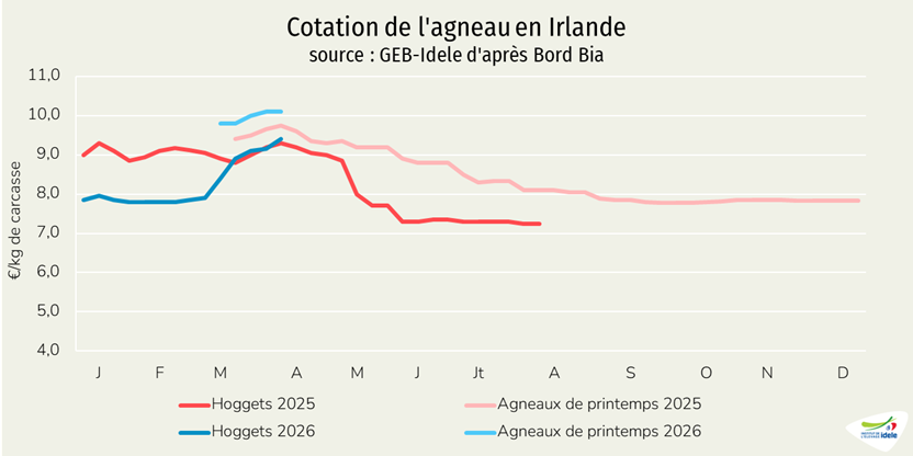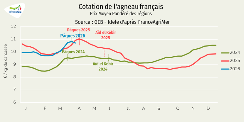 Pour Pâques 2026, la cotation de l’agneau français a atteint 10,83 €/kg, en baisse de 0,21 €/kg comparée à Pâques 2025. Au global l’offre pascale française a été en baisse cette année. Mais une différences entre le Nord et le Sud de la France a été observée. Le Nord a manqué d’agneaux tandis qu’au Sud, où ils sont dans l’ensemble moins chers, l’offre était suffisante. La moitié sud de la France ayant probablement plus pesé dans les volumes nationaux, cela peut expliquer, au moins en partie, la baisse des cours nationaux comparés à l’an passé.