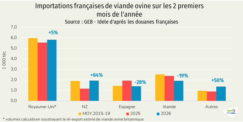 Les importations françaises de viande ovine destinées au marché français (en soustrayant le réexport estimé de viande ovine britannique) ont rebondi de 21% en février 2026, totalisant 7 000 téc. Au total, sur un cumul de deux mois, elles ont augmenté de 4% /2025, totalisant 12 500 téc (-3% /moyenne 2015-2019). Elles ont reculé en provenance d’Espagne et d’Irlande mais ont augmenté en provenance du Royaume-Uni et de Nouvelle-Zélande.