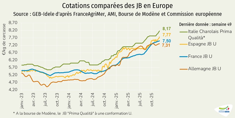 La France suit le mouvement. La cotation française du JB U atteignait 7,80 €/kg en semaine 49 (+28% /2024).